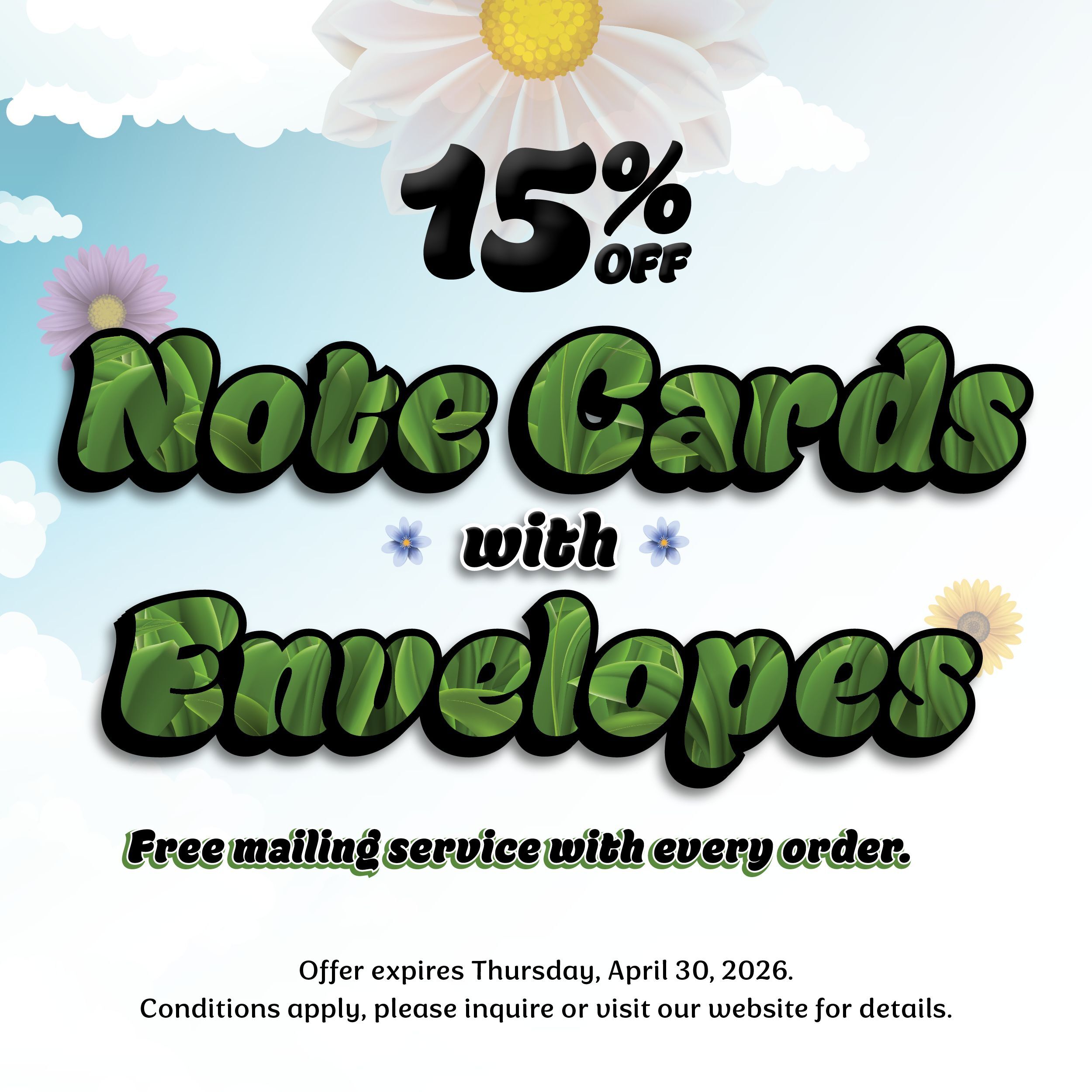 Note cards and matching envelopes are available in a variety of sizes and sold separately. A-style flaps are square and have gum closure. See Distributor's Guide or stock list for stock availability.
